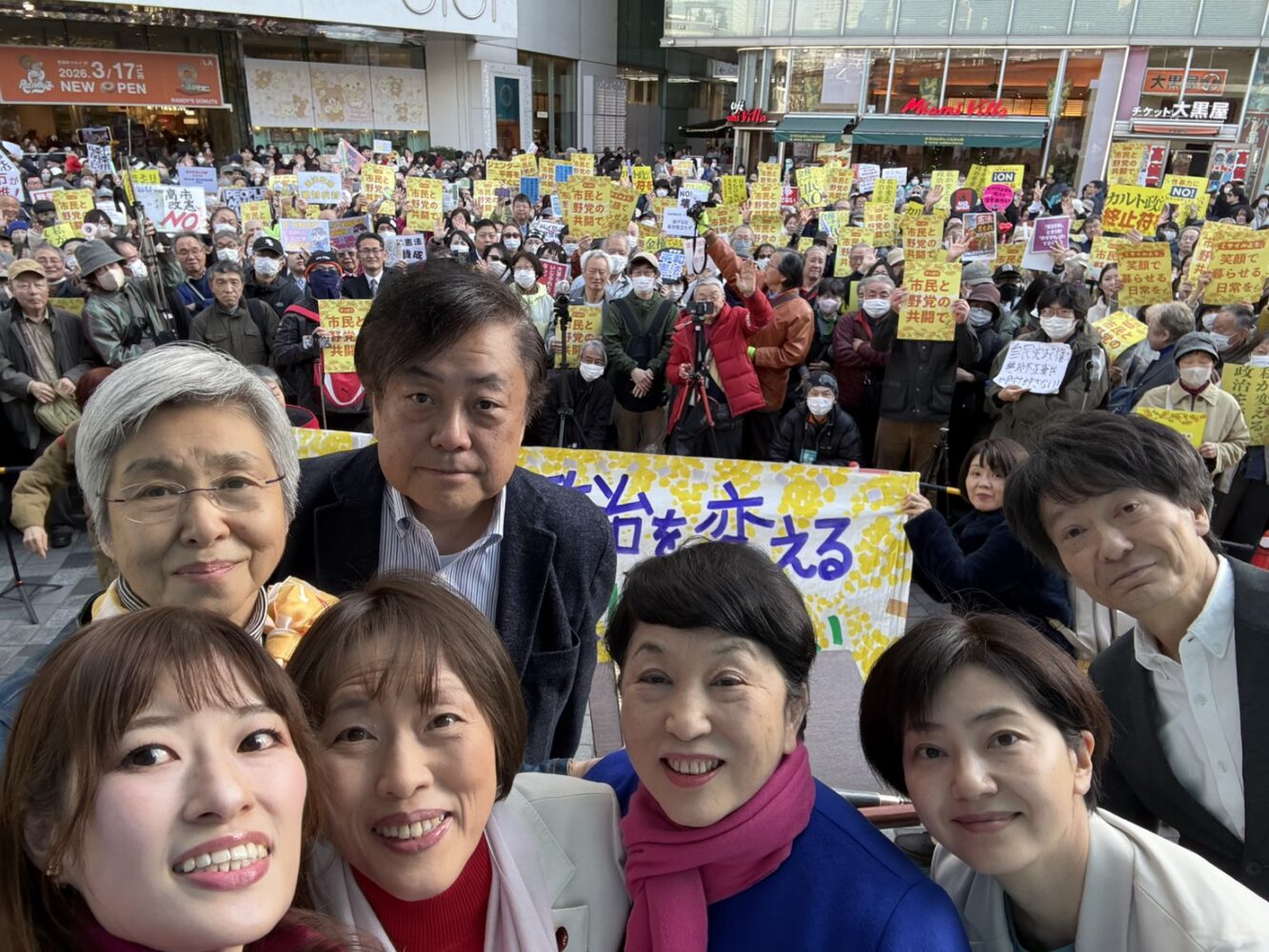 2026年2月22日、市民連合が主催して「信じられる未来へ 希望の新しい選択肢 2.22市民と野党の共同アクション」を開催しました。会場の有楽町イトシア前は、約1000人の参加者でぎっしりと埋め尽くされました。